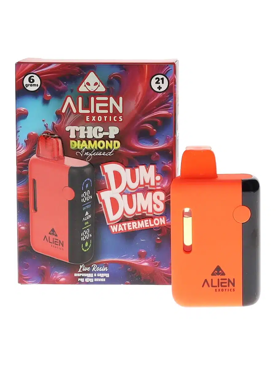 Elevate your vaping experience with the Dum Dums Watermelon Alien Exotics THC-P Diamond Infused Live Rosin Disposable 6G. This premium hybrid vape combines potent THC-P diamond concentrate with live rosin extract, delivering a flavorful and powerful session. Perfect for users who demand quality and convenience, this device ensures smooth, consistent, and elevated hits every time.